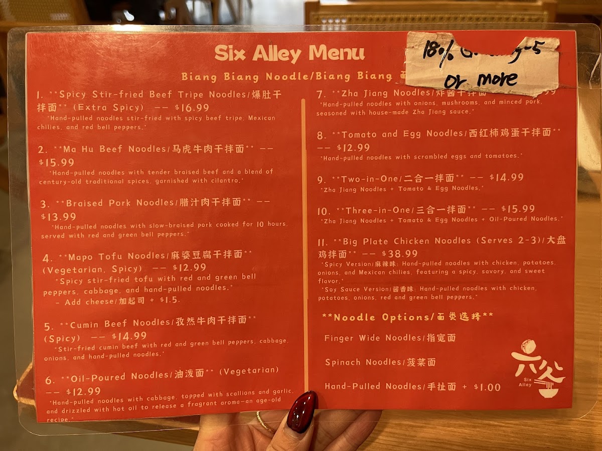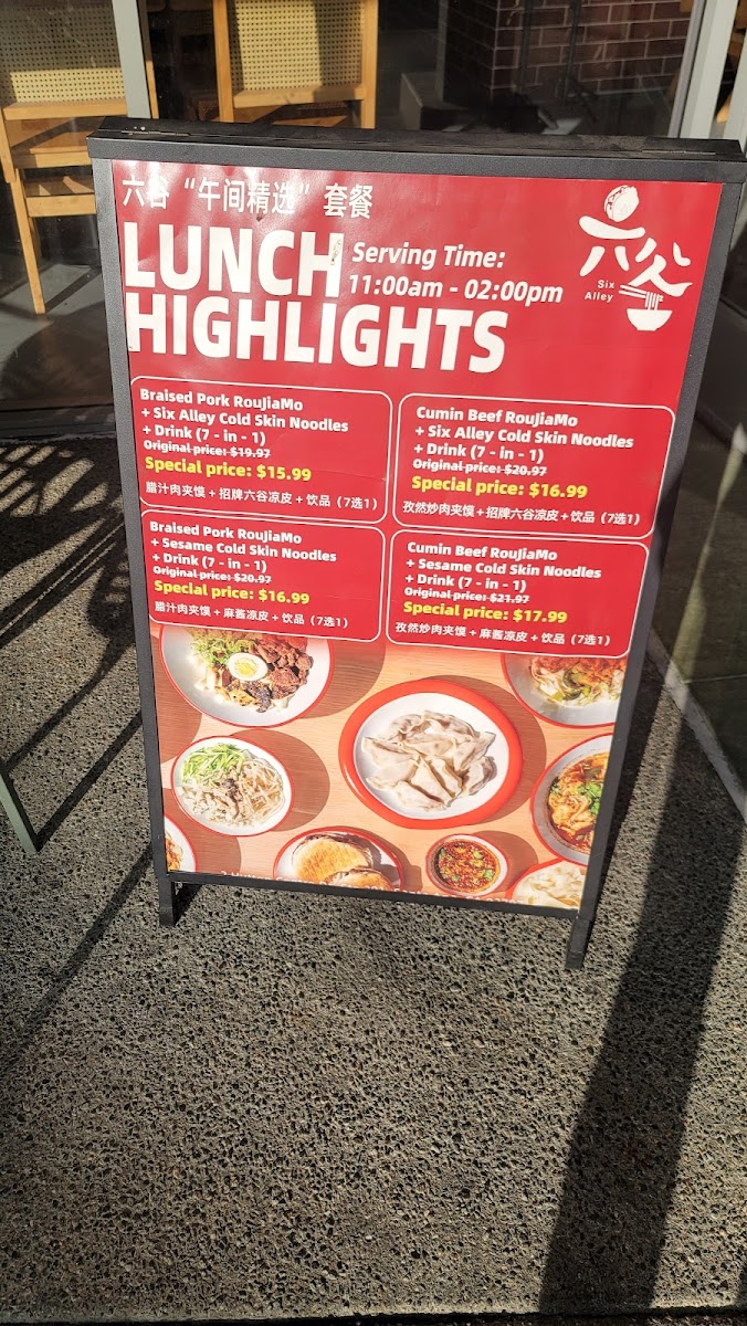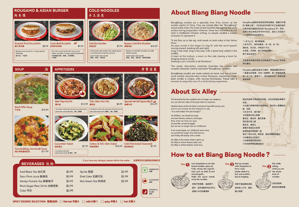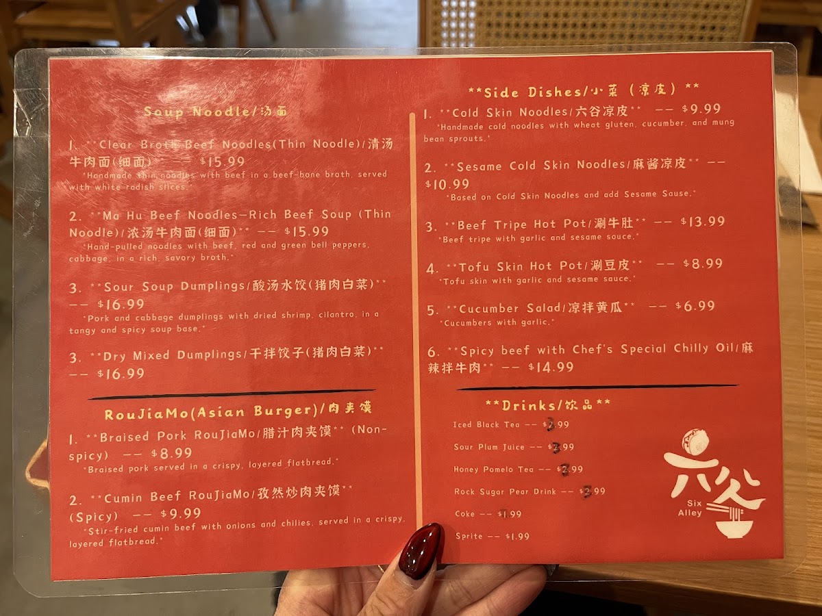 The menu at Six Alley offers a variety of traditional Chinese dishes with a focus on handmade noodles and flavorful meat options. Available throughout the day, the food selection is organized primarily around signature noodle dishes, roujiamo (Asian-style burgers), and complementary salads and dumplings.
