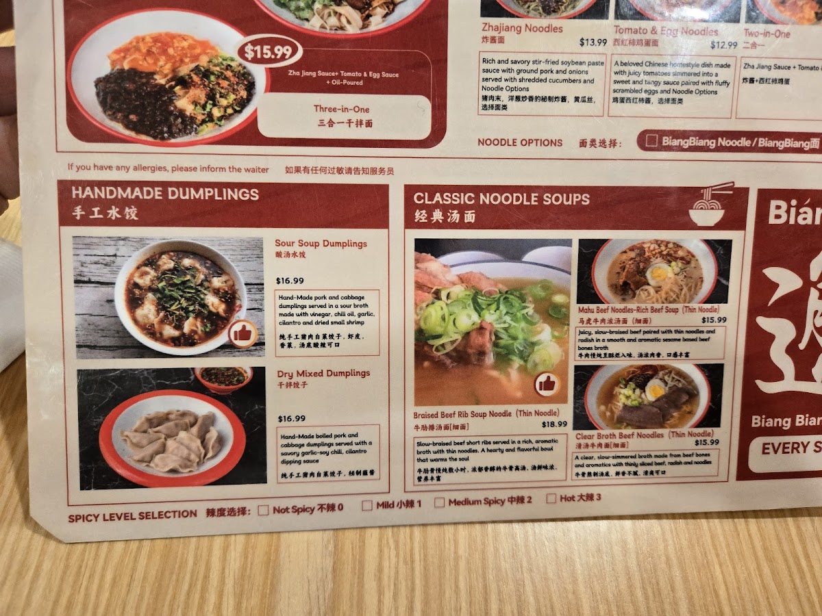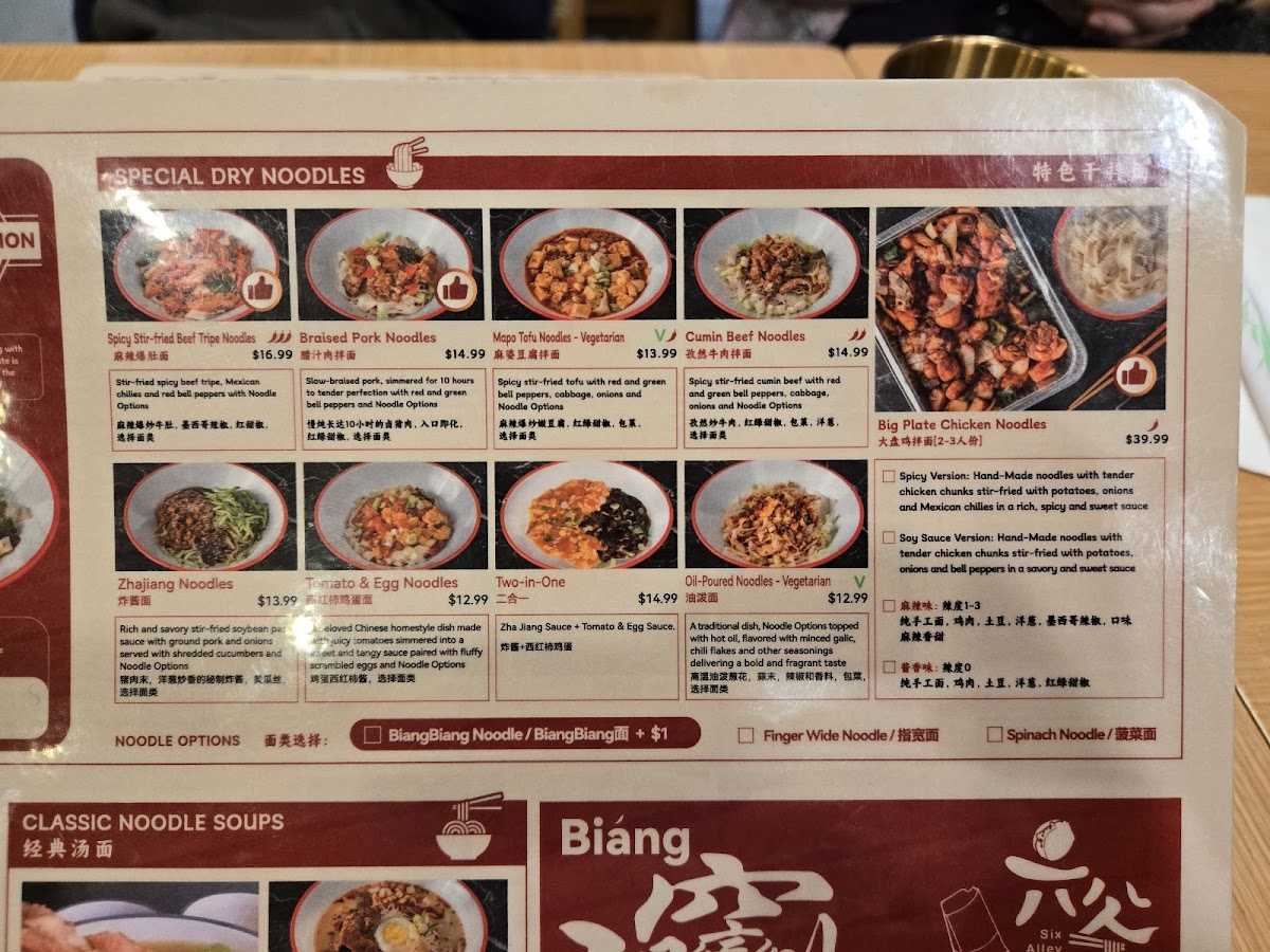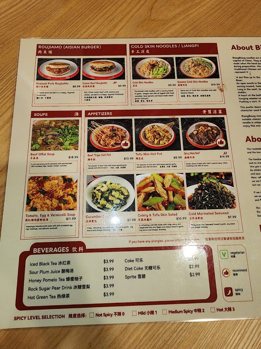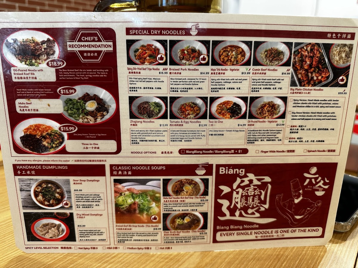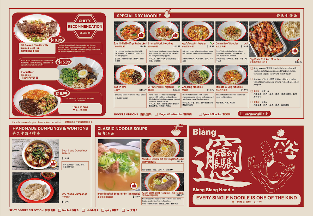 The noodle section features several types of BiangBiang noodles, including braised pork, mapo tofu, cumin beef, and oil-poured noodles, among others. Some dishes provide options for varying spiciness levels, and chili oil can be added on the side for additional flavor.
