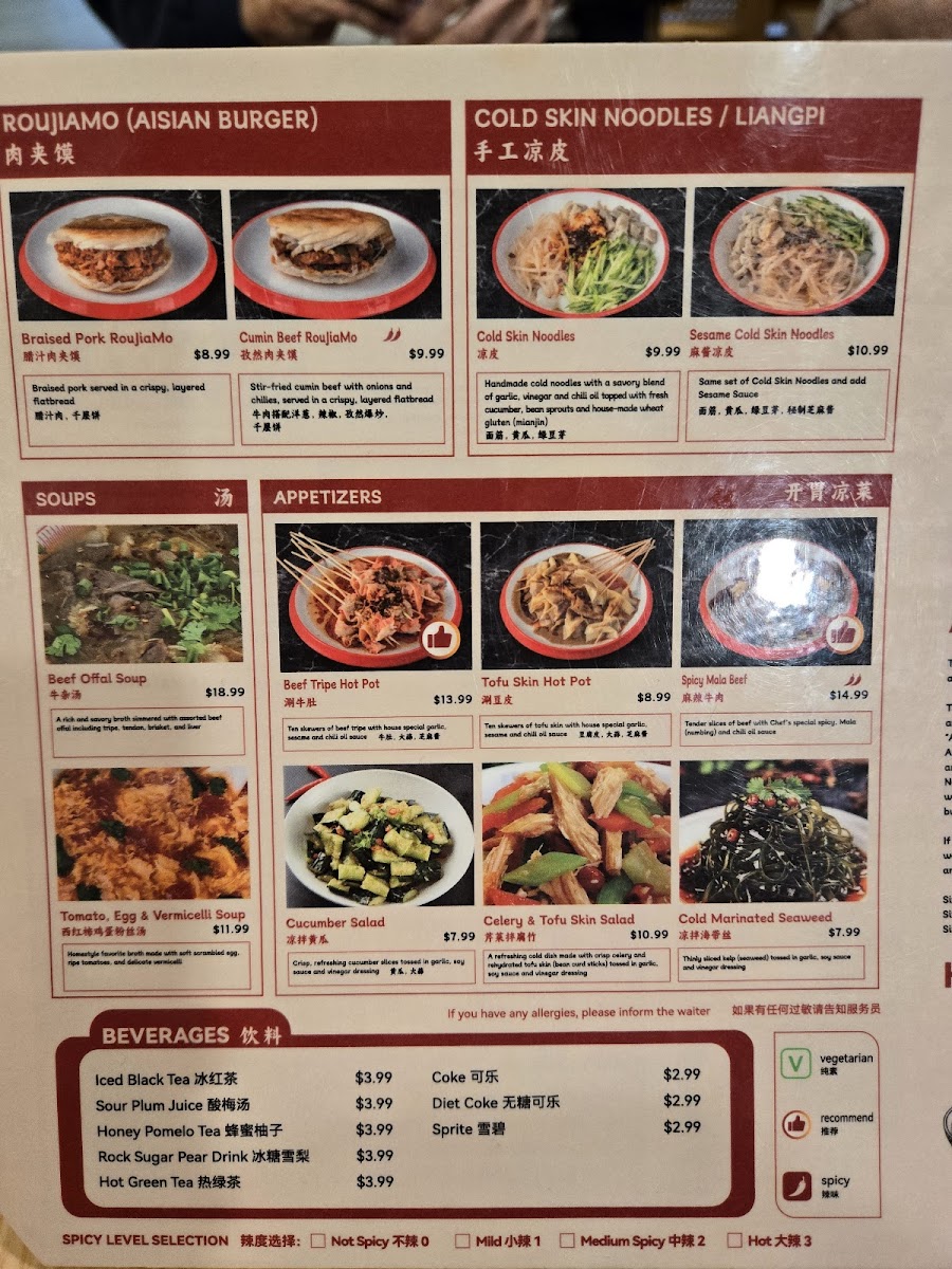 Roujiamo, known as Chinese-style sandwiches, are available in spicy and non-spicy varieties, such as cumin beef and braised pork. These items make for a quick, filling choice suitable for casual meals.